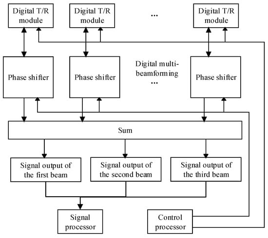 There are two ways to obtain multi-beam data. One way is using one set of receiving feeders to separate multi-beam data in the Doppler domain, the other way is using multiple sets of feeders to obtain multi-beam data in time domain. When multi-beam data is separated in the Doppler domain, the Doppler bandwidth of the multi-beam signal is large. To prevent spectrum aliasing, a large PRF is required. Reference [] gives a design to reduce the PRF, and the PRF is the sum of the Doppler bandwidth of multi-beam signals, but the method limits beam pointing. In addition, when using the ultrahigh speed platform, the Doppler bandwidth of the multi-beam signal becomes large. As a result, a large PRF is required. As shown in Figure 2, the multi-angle SAR imaging system proposed in this paper uses three sets of receiving feeders and the digital T/R modules are divided into three groups, each with independent receiving feeder and phase shifter. The multi-beam data are separated in the time domain. Thus, the PRF is equal to the Doppler bandwidth of a single beam. At the same time, there is no restriction on the direction of the beam, and the required beam pointing can be set. When the scattering angles vary from 20° to −20°, the results of the imaging will be different []. In order to get as much information as possible in the scene, the difference in the direction of the three beams is at least 20°.