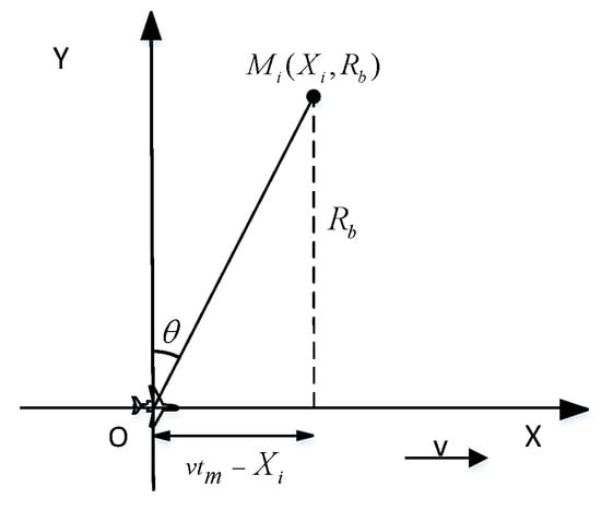 To illustrate the derivation process of the echo signal, the imaging relationship at point A in Figure 3 is drawn separately, as shown in Figure 4. is one point in the scenario and is the closest distance from the point target to the aircraft trajectory. The distance from the aircraft to the point target can be expressed as: