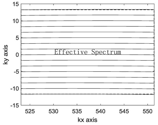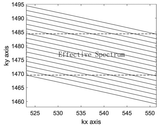 The RMA algorithm performs range cell migration compensation, secondary range compression and azimuth compression by interpolation [,]. For 20° squint, the two-dimensional spectrum is distorted, and it needs to extract a rectangular aperture of data adequately in such 2-D support [], as shown in Figure 5; it needs to discard part of the spectrum due to the squint angle, which reduces the energy of targets after imaging. For each of the determined , the variation of with is shown by the arc in Figure 5.