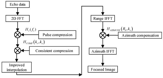 RMA [,,,,,,] achieves SAR imaging in the wave number domain. In spite of the squint angle value, it can perfectly focus the whole scene without using any approximate conditions. The range cell migration compensation, secondary range compression and azimuth compression are achieved by Stolt interpolation []. In principle, it is the optimum algorithm for SAR imaging []. However, the Stolt interpolation needs huge computation. Since the multi-angle SAR imaging system adopts the method of multi-beamforming, the beam squint angle is more than 20°, and the RMA algorithm can process the data of the squint SAR. It can focus the whole scene by interpolation. For 20° squint, the general interpolation formula has low spectrum utilization (Section 3.3. for details.), and the improved RMA algorithm is used to improve the spectrum utilization.