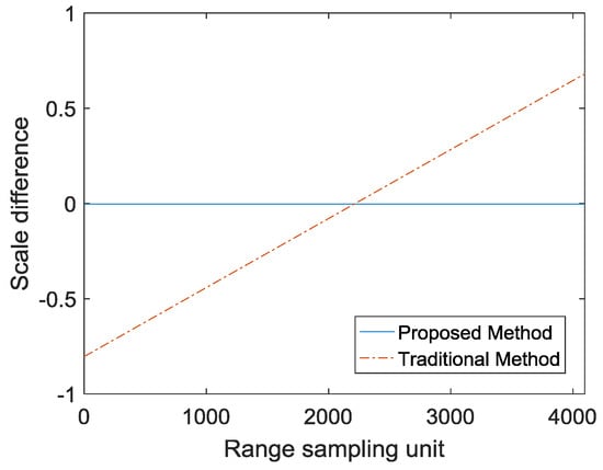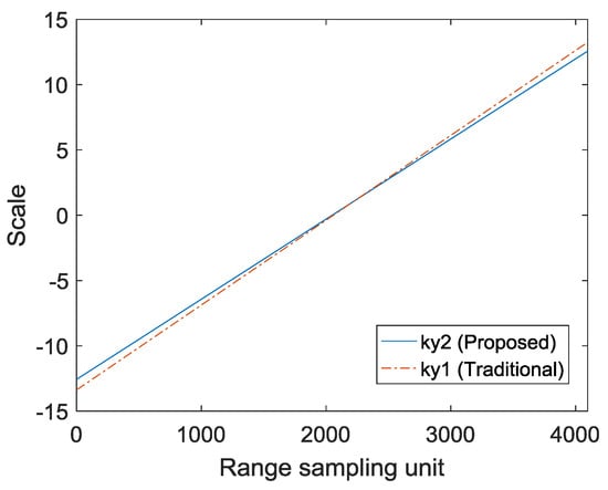For accurate matching, images need to have a uniform scale. The bandwidth of represents the range bandwidth after interpolation. In order to have the same range resolution of multiple-angle images in the time domain, the bandwidth of is required to be the same. The traditional method is to intercept the largest rectangle in the interpolated spectrum, as shown in Figure 5. The traditional method is used to determine . Let , , , and is the number of range sampling units, and then . The result of is shown in Figure 8. The slope greater than 0 represents the bandwidth of is greater than the bandwidth of . In the images of different views, the bandwidth of is inconsistent and there is a slight change in the range resolution of the time domain. In general SAR imaging applications, it can be ignored. However, the change in the range resolution will lead to inaccurate matching and affect the quality of the fusion in image matching. In the proposed method, in order to unify the bandwidth of in different view images, the center value of is first determined, and then the bandwidth of is determined according to the bandwidth of the . The proposed method is used to determine and . As shown in Figure 9, the bandwidth of is smaller than the bandwidth of , which means that the proposed method discards a small portion of the spectrum. The result of is shown in Figure 8. The slope is 0, which represents the bandwidth of is the same as the bandwidth of . In the images of different views, the bandwidth of is consistent, and different images have the same range resolution in the time domain. The advantage of the scale uniformity is obvious in image matching.
