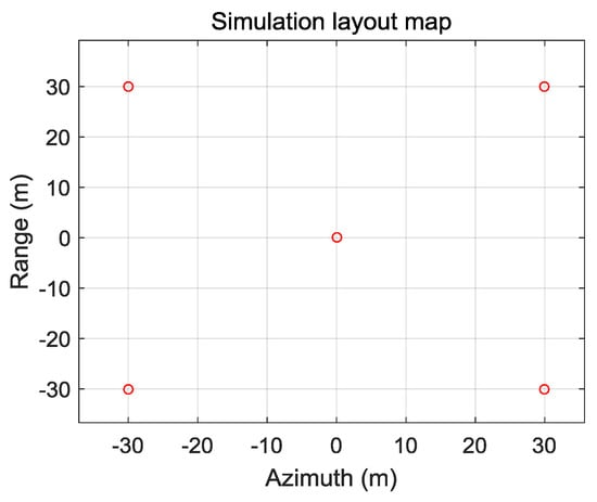 In order to verify the validity of the algorithm, the simulation data are used for explanation. The simulation resolution is 0.3 m × 0.3 m, the wavelength is 3 cm, the center frequency is10 GHz, the signal bandwidth is 500 MHz, the range sampling rate is 600 MHz, the pulse width is 3.5 µs, the speed of aircraft is 100 m/s, the antenna aperture is 0.6 m, and the pulse repetition frequency is 450 Hz. The closest distance from the center of the scenario to the aircraft route is 30 km. Three beams are used with a beam spacing of 20° and the beam width is 2.86°. There are five points in the scene, and the simulation scenario layout is shown in Figure 10. The center point target is located at (0, 0), and the remaining four points are located at (±30, ±30).