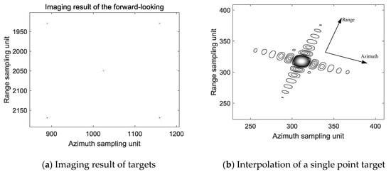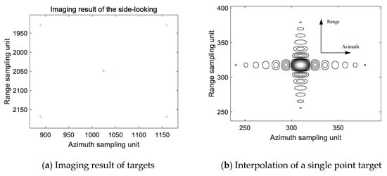 The scenario image of the side-looking beam processed by the above imaging algorithm is shown in Figure 12a, the position of the center point target is (1025, 2050), and the positions of the remaining four points are (1025 ± 135, 2050 ± 120). The distance between the center point target and the rest of the point target in the azimuth direction is 135/1.35 × 0.3 = 30 m, and the distance between the center point target and the rest of the point target in the range direction is 120/1.2 × 0.3 = 30 m, which is consistent with the scenario layout. Figure 12b is a result of interpolation of the point (1025 − 135, 2050 − 120) in Figure 12a. It can be seen that the point target in side-looking beam is well focused. The profiles of range and azimuth-spread function of the target are presented in Figure 12c,d. The PLSR along the range direction shown in Figure 12b is −13.2231. The ISLR along the range direction is −9.8464. The PLSR along the azimuth direction shown in Figure 12b is −13.2602. The ISLR along the azimuth direction is −9.8962.