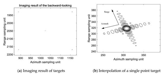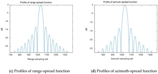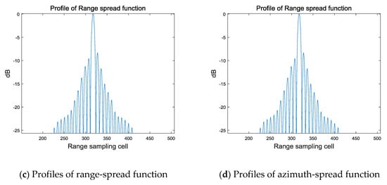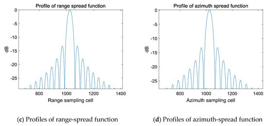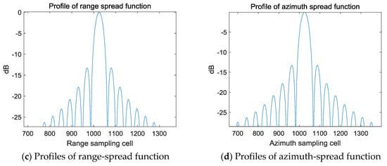 The scenario image processed by the above imaging algorithm for the backward-looking beam is shown in Figure 13a. the position of the center point target is (1025, 2050), and the positions of the remaining four points are (1025 ± 135, 2050 ± 120). The distance between the center point target and the rest of the point target in the azimuth direction is 135/1.35 × 0.3 = 30 m, and the distance between the center point target and the rest of the point target in the range direction is 120/1.2 × 0.3 = 30 m, which is consistent with the scenario layout. Figure 13b is a result of interpolation of the point (1025 − 135, 2050 − 120) in Figure 12a. It can be seen that the point target in backward-looking beam is well focused. The profiles of range and azimuth-spread function of the target are presented in Figure 13c,d. The PLSR along the range direction shown in Figure 13b is −13.2299. The ISLR along the range direction is −9.8458. The PLSR along the azimuth direction shown in Figure 13b is −13.2536. The ISLR along the azimuth direction is −9.8859.