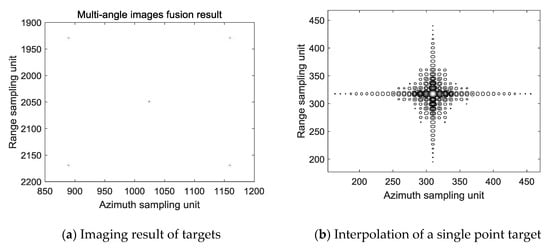 According to the time difference represented by the Formula (5), or the difference in the number of azimuth points represented by the Formula (6), the front-view beam imaging result is delayed by 2Δt, the due side-view imaging result is delayed by Δt, and then image fusion of multi-angle SAR is completed after superimposition on back-view beam. The result of the fusion is shown in Figure 14a. Figure 14b is a result of interpolation of the point in Figure 14a. It can be seen from Figure 14a,b that the imaging and fusion of images can be completed in a uniform coordinate system within a viewing angle range of −20° to 20°. The Range PSLR is −8.31 and the azimuth PSLR is −6.37.