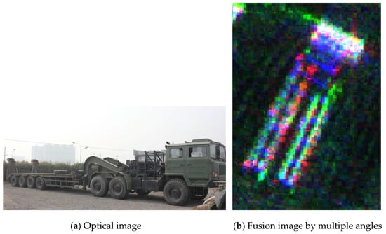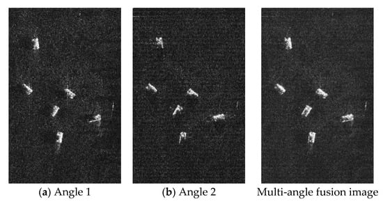 Figure 15a,b are images of six vehicles with forward-looking and backward-looking views. It can be seen that the target information obtained is not complete because of sheltering of the single-view target. Figure 15c is obtained through the image fusion of two angles of view. From which, complete geometric features of the target can be seen clearly. The information entropy is used to evaluate the effects of image fusion. Information entropy in Figure 15a,b are 6.1819 and 6.1046, and information entropy in Figure 15c is 6.6635. The information entropy in the image increases after fusion. This means the fused image contains more information about the targets.