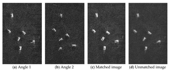 Figure 16 shows the image fusion results of Range–Doppler algorithm. Different from the proposed method, the result of angle 2 has a deformation, and the image registration needs to be performed after the image is corrected. When the images are fully registered, the images can be well fused as shown in Figure 16c. When the image is not fully registered, part of the target information will be lost as shown in Figure 16d.