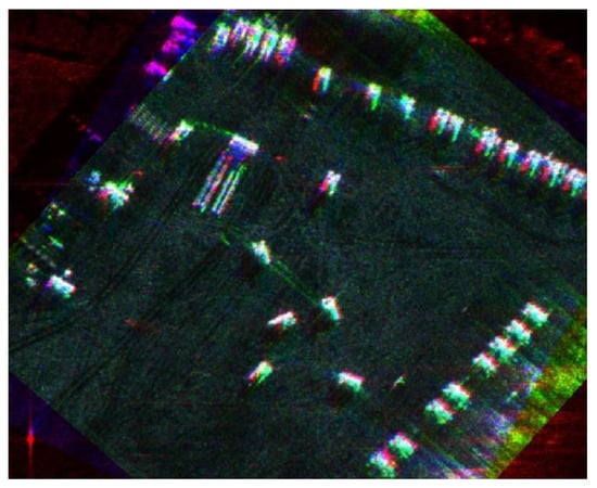 The data of each beam are processed independently to obtain images. When fusing the images from different beams, it is necessary to ensure the matching of the position of the target. According to (6), the forward-looking image is moved back by azimuth sampling units, and the side-looking image is moved back by azimuth sampling units. The images obtained from the three beams are fused in backward-looking image.