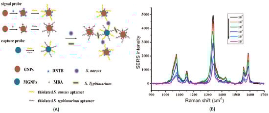 In the sandwich detection method, the capture probes (nanoparticles labeled with complementary DNA sequences) and signal probes (DNA-functionalized nanoparticles labeled with Raman reporter molecules) are designed [35]. The two DNA sequences are non-complementary, but both of them are complementary to the target DNA. When the target DNA is introduced, hybridization between the target DNA and probes results in the formation of a sandwich structure and the aggregation of the nanoparticles, based on the complementation pairing rule. In this process, the concentration of hot-spot formation is significantly increased, and the Raman signal of Raman reporters is greatly enhanced. The SERS-based sandwich detection method provides a special hybridization method for detecting DNA, with satisfactory selectivity and stability. The multiple detection of target DNA, as a trend in SERS detection, is much more meaningful in reality because of its timesaving advantage. In order to increase the specificity of DNA and Raman reporters on the probe, it is necessary to avoid overlapping characteristic signals between Raman reporters. Zhang et al. used 5,5′-dithiobis(2-nitrobenzoic acid) (DNTB) and mercaptobenzoic acid (MBA) as Raman reporters to simultaneously measure the staphylococci S. aureus and S. typhimurium in pork, with detection limits of 35 cfu/mL and 15 cfu/mL, respectively (Figure 1) [36]. Herein, gold nanoparticles were modified with MBA, DNTB and aptamer to develop a signal probe, and an enhanced Raman intensity was obtained due to the utilization of nanoparticles. Meanwhile, Fe3O4 magnetic gold nanoparticles were immobilized with aptamers to prepare the capture probe. As single strand nucleic acids, which can normally form three-dimensional conformations, aptamers exhibited a high affinity with the target molecules. The specificity of this method used for detecting S. aureus and S. typhimurium was investigated. This indicated that the signal intensities of other bacteria, including Escherichia coli, Shigella dysenteriae, Vibrio parahaemolyticus and Bacillus cereus, were much lower than those of the S. aureus and S. typhimurium. This could be attributed to the high affinity and specificity of the aptamer with its target, facilitating the accomplishment of sandwich detection.