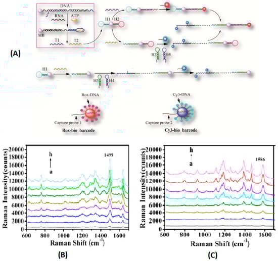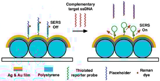 In the DNA hybridization method, Raman-labeled ssDNA is fixed on the nanoparticles as probes. After introducing the target DNA, hybridization between the probes and the target DNA will change the intensity of Raman molecules by changing the distance between the nanoparticles and Raman molecules. The identification of the target DNA and detection of its content can be obtained by measuring the intensity changes of the Raman molecules [44,45,46]. Based on the above mechanism, dengue diagnosis and HIV-1 detection have been successfully achieved (Figure 2) [47,48].
