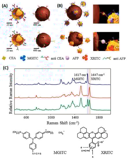 Schematic of the SERS-based duplex immunoassay using hollow gold nanospheres (HGNs) and magnetic beads. (A) Conjugation of malachite green isothiocyanates (MGITCs) (Raman reporter) and carcinoembryonic antigen (CEA) antibodies to HGNs (upper left), conjugation of X-rhodamine-5-(and-6)-isothiocyanate (XRITCs) (Raman reporter) and α-fetoprotein (AFP) antibodies to HGNs (upper right), anti-CEA immobilized magnetic beads (lower left), and anti-AFP modified magnetic beads (lower right). (B) Formation of sandwich immunocomplexes between HGNs and magnetic beads for CEA and AFP. (C) Raman spectra of HGN probes labeled with MGITC (blue), XRITC (red) and a 1:1 mixture of HGNMG and HGNXR (green) (Chon et al. [76]).