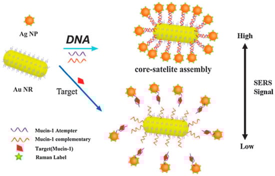 Scheme of the SERS aptasensor for the detection of Mucin-1 based on Au NRs-Ag NP core-satellite assemblies (Feng et al. [78]).
