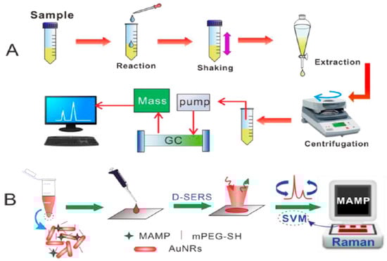 Detecting the microbes in food is important for guaranteeing the quality and safety of food, avoiding the occurrence of food poisoning. A traditional microbial test is usually time-consuming, with a long separation and cultivation process. In comparison, SERS can recognize the microbe by detecting the related gene sequences in less time, with a high specificity and accuracy.