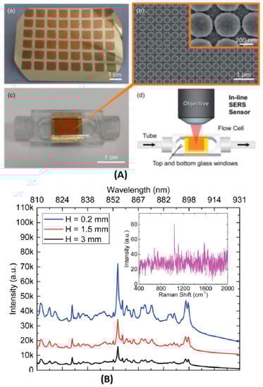 (A) (a) Image of the PNA surface fabricated on a flexible polymer sheet. (b) SEM image of the completed PNA surface. Inset: close-up SEM image of the PNA surface, with a measured inter-dome separation distance of 15-20 nm. (c) Image of the SERS sensor, assembled by the incorporation of the flexible PNA substrate into a plastic flow cell. (d) Schematic of an in-line SERS sensor, where two cylindrical openings at the ends of the SERS sensor are connected in a series with biomedical tubing and a 785 nm laser, focused on the PNA surface by a 50 objective. (B) SERS spectra of 25 mg mL−1 promethazine solution for SERS sensors with varying chamber heights (H). Primary SERS intensity peak for promethazine can be observed at 1037 cm−1. The inset represents the Raman spectrum of 25 mg mL−1 promethazine solution, acquired when the laser was focused on a uniform non-nanostructured gold surface. (by H. Y. Wu [103]).