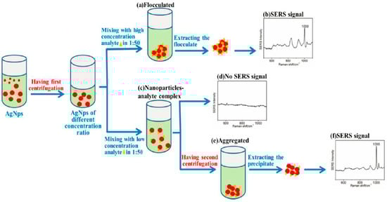 Diagram of the detection process of phenformin hydrochloride by the SERS-based two-step centrifugation method. (a) The concentrated AgNPs were flocculated when high concentration phenformin hydrochloride was added. (b) Characteristic peak of the phenformin hydrochloride were detected at 1000 cm−1. (c) The concentrated AgNPs were unflocculated, and an analyte-AgNPs complex was formed when a low concentration analyte was added. (d) No characteristic peak of the phenformin hydrochloride was detected. (e) An aggregated analyte-AgNPs complex and the interparticle gap decreased after the second centrifugation. (f) Characteristic peak of the phenformin hydrochloride were obvious at 1000 cm−1 (Chen et al. [106]).