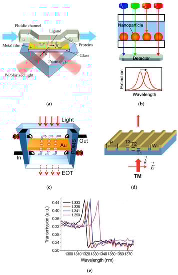 Schematic of plasmonic sensors. (a) Surface plasmon resonance (SPR) sensor requiring prism coupling. Reprinted from [93] under CC BY 3.0. (b) Localized surface plasmon resonance (LPSR) based sensor composed of an array of metallic nanoparticles. Reprinted with permission from [110] under CC BY-NC 3.0. Copyright © The Royal Society of Chemistry (RSC) (2014). (c) An array of metallic nanoholes operating on the principle of extraordinary optical transmission (EOT). Reprinted with permission from [111]. Copyright © SPIE (2010). (d) Schematic of plasmonic structures having Fano resonance. (e) Fano resonance shift by change of refractive indices. (d,e) Reprinted from [103] under CC BY 4.0.