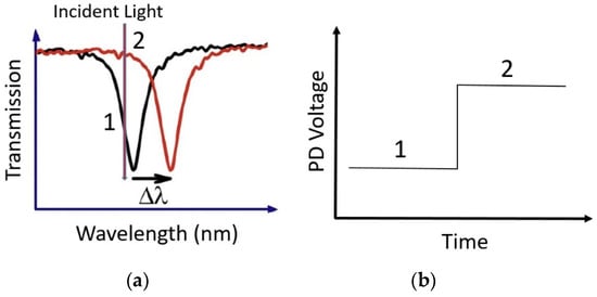 (a) Resonance wavelength shift due to change in the refractive index. Keeping the incident wavelength fixed (red vertical arrow), the intensity of light impinging on the PD changes from level 1 to level 2 resulting in the increase in the PD output voltage/current from level 1 to 2 as shown in (b).