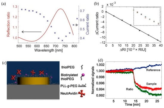 Measurement results of the sensor chip detailed in Mazzotta et al. [68]. (a) The red curve is the ratio between the reflection from the nanodiscs and the reference PD showing the reflection response of the gold nanodisc array. The blue curve represents the PD photocurrent ratio for different wavelengths of the incident light. (b) The graph represents the change in the PD current ratio versus change in the refractive while keeping the incident light fixed at 780 nm. (c) Graphical illustration of specific binding of neutravidin with gold nanodiscs. (d) Normalized photocurrent from reference PD (blue), PD with nanodisc array (red) and the photocurrent ratio (green). The curves are normalized with their initial values which were 1.679 V for the reference (blue) curve, 0.693 V for the PD with nanodiscs (red) and 0.413 V for the photocurrent ratio (green). Reprinted with permission from [68]. Copyright © Elsevier (2010).