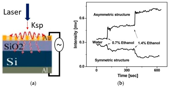 (a) Schematic of plasmonic nanostructures integrated with the silicon photodetector. (b) Output of the sensor showing measurements for symmetric and asymmetric plasmonic nanohole arrays when water and different concentrations of ethanol were applied. Reprinted with permission from [69]. Copyright © The Optical Society (OSA) (2011).