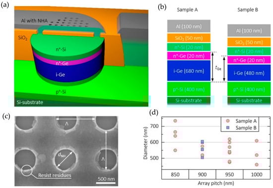 (a) Schematic illustration of the device presented in Augel et al. [73], showing the cross section of the germanium PD and integrated aluminum nanohole array in the metal contact area. (b) Schematic showing the layers of the germanium PD where the germanium layer thickness is 780 nm and 500 nm for sample A and B respectively. (c) SEM image of the aluminum nanohole array integrated with the germanium PD. (d) The physical parameters (hole diameter and the pitch) of various nanohole arrays fabricated in the metal contact area of the germanium PD. Reprinted with permission from [73]. Copyright © American Chemical Society (ACS) (2018).