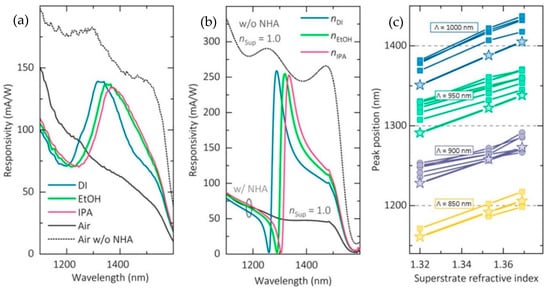 The performance of the integrated sensing system was demonstrated by changing the refractive index of the surroundings of the nanohole array by adding DI water (n = 1.320), ethanol (n = 1.353), and isopropyl alcohol (IPA) (n = 1.369). As the refractive index of the solution increased, the Fano resonance of the nanohole array redshifted, which was read out as the redshift in the responsivity spectrum of the integrated germanium PD, as shown in Figure 9. From the measurements, the maximum sensitivity for the most optimized parameters of the device estimated from the germanium PD responsivity data was 1180 nm/RIU, which is even higher than the non-integrated plasmonic sensors.