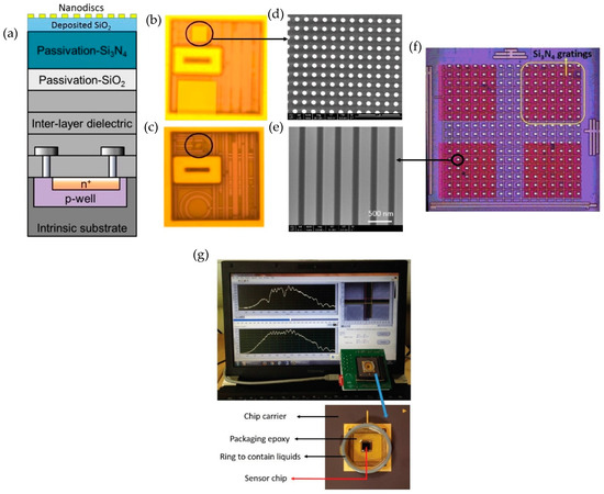 (a) Cross section schematic of the complementary metal oxide semiconductor (CMOS) PD chip with integrated gold nanodisc array. (b,c) Microscopic images of the CMOS PD chip. (b) with and (c) without integrated gold nanodisc arrays. The PD area is encircled in both cases and have dimensions of only 6 × 8 µm. (d) SEM image of the gold nanodiscs integrated on top of the CMOS PD chip. (e) SEM image of the silicon nitride gratings fabricated on top of the CMOS PD chip. (f) Microscopic image of the silicon nitride gratings integrated with the CMOS PD chip having an array of PDs. The four dark areas, one of which is encircled shows silicon nitride gratings. The PD pixels between the silicon nitride gratings were used as a reference. (g) Packaged sensor chip connected with the laptop with readout displayed on the laptop screen. (a–d) reprinted with permission from [74]. Copyright © American Chemical Society (ACS) (2016). (e–g) reprinted with permission from [76]. Copyright © IEEE (2018).