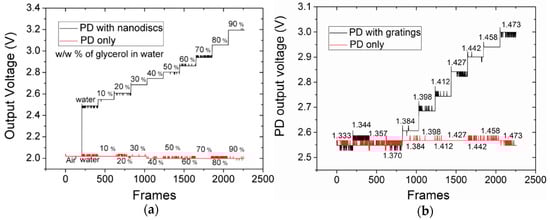Measured changes in the PD output voltage for various glycerol concentrations as detailed in Shakoor et al. [74,76]. The black staircase curve is the readout from the PD with integrated nanophotonic sensors while the flat red curve corresponds to the readout from the PD with no nanophotonic structures. (a) Measured PD voltage for the gold nanodisc array sensor. (b) Measured PD voltage from the silicon nitride grating sensor. In (a) the data for the PD output voltage is presented for different concentrations of glycerol while in (b) the data is presented in terms of the refractive indices of different concentrations of glycerol. (a) reprinted with permission from [74]. Copyright © American Chemical Society (ACS) (2016). (b) reprinted with permission from [76]. Copyright © IEEE (2018).