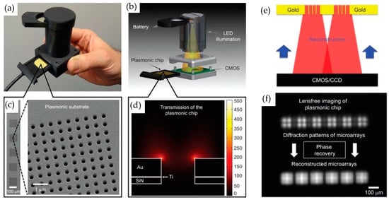 To get rid of the bulky external equipment to measure nanophotonic sensor chips, Cetin et al. used a lens free computational imaging system to record the transmission response of the plasmonic nanostructures [77]. In this work, CMOS/CCD imaging sensor was used to record the changes in the diffraction patterns of the plasmonic nanohole array due to the optical resonance wavelength shift. Following this approach, a handheld nanophotonic sensing system having 7.5 cm height and 60 g weight was demonstrated. The photograph of the packaged sensor developed in this work is shown in Figure 12a. The complete sensor system consists of a battery, LED light source, plasmonic chip consisting of an array of nanoholes and an imager. The battery, LED and the imager are enclosed in a housing while the plasmonic sensor chip is slid into the housing as shown in Figure 12b. An LED is used as an excitation source while the diffraction patterns generated by the plasmonic modes of the nanoholes array are imaged by the CMOS/CCD imaging chip which can be bought off the shelf. To enable multiplexed measurements, an iterative phase retrieval-based image reconstruction method was also employed to reconstruct the overlapped diffraction patterns from simultaneous measurements. The reconstructed diffraction patterns are shown in Figure 12f.