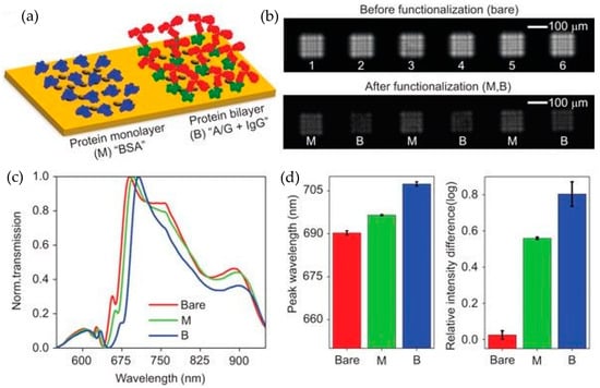 Angle sensitive plasmonic nano gratings were also integrated with the bulk silicon photodetector in [71,72]. In [71], Perino et al. measured the sensitivity in terms of the change in the transmission intensity of the zero-order diffracted ray of the functionalized and unfunctionalized grating and reported its value as 2.94/RIU, while the detection limit of the integrated sensor was reported to be 2.2 × 10−4 RIU.