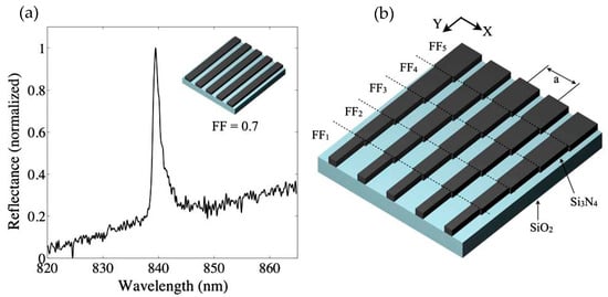 (a) Reflectance spectrum of standard rectangular gratings. (b) Schematic of chirped gratings. To induce chirping, the fill factor was changed along the Y direction which created a set of rectangular strips each having different fill factors along the Y-direction. Reprinted from [78] under CC BY 4.0.
