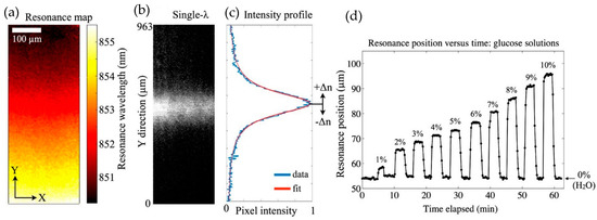 Experimental results presented in Triggs et al. [78]. (a) Resonance wavelength map when water is surrounding the gratings. (b) Measured brightfield image of the gratings when excited by a monochromatic light source. (c) Intensity profile of the measured resonance brightfield image shown in (b). The intensity profile is averaged and normalized. The change in refractive index of the grating cladding induces shift in the peak position of the intensity profile. (d) Shift in the peak position when the refractive index is changed by introducing different concentrations of glycerol. Water was added after each concentration measurement, which moved the peak position back to the original value (0% glycerol). Reprinted from [78] under CC BY 4.0.