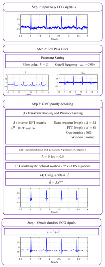 Based on the sparse denoising framework in Figure 1 and the sparsity recovery algorithm in Algorithm 2, we propose the GMC-penalty ECG denoising method. The detailed processing flow of the method is shown in Figure 3 with some key parameter settings. The whole process consists of four steps. At the first step, the noisy ECG signal is sent to a low-pass filter. At the second step, the output of the LPF and the residual signal are obtained. Two parameters of the LPF, i.e., the order k and the cutoff frequency is should be configured beforehand. The next step is to perform sparse recovery following Algorithm 2. The linear transform matrix A, the data length R, the data overlapping ration and the window function should be set before applying the algorithm. Moreover, the regularization parameter and the convexity-guaranteeing factor are also set at the start of the algorithm. After processing by Algorithm 2, the optimal solution is obtained for each data frame. Since is the sparse coefficients in frequency domain, we should further recover the denoised sparse signal through the calculation . Finally, we obtain the denoised ECG signal by synthesizing the low-pass component and the high-frequency sparse component in the last step.