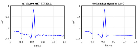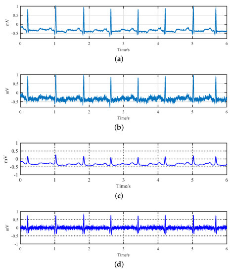 The performance of the proposed algorithms are evaluated based on the ECG records of the MIT-BIH arrhythmia database [46]. The database contains a total of 48 records, each record length is 30 min, the sampling rate is 360 Hz. We note that the original signals in the MIT-BIH database have been filtered by a band-pass filter with a passband from 0.1 to 100 Hz. However, it is obvious that the noise components falling in the passband will not be eliminated. To understand its influence on the clean signal, we make an observation of the original signals in the database, as shown in Figure 4a. It can be observed that there exist noise components in the signals, but the amplitudes of the noise components are relatively weak compared with the useful signal. In order to gain deeper insight into the influence of the noise on our algorithms, we process the original signal directly using our algorithms, and the results are shown in Figure 4b. It can be perceived that the weak noise in the original signal is ‘smoothed’ out by our algorithms. That is to say our algorithms have the ability to suppress the noise in the acquired signals. However, considering that the original noise in the original signals of the database is relatively weak, we omit its impact on the ‘true’ signal. In this case, we call the original signals in the MIT-BIH database as ‘pure signal’, despite there existing very weak noise in practice.