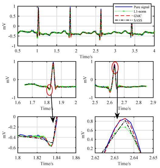 As the final step of the proposed denoising scheme, we obtain the final denoised ECG signal by adding the outputs of the LPF and the sparsity recovery block according to Figure 1. The resulting waveforms are shown in Figure 8. It can be observed that all the three methods, i.e., the proposed -norm method, the proposed GMC method and the SASS method, eliminate the noise effectively. However, the -norm method underestimates the R-peaks visibly as shown in the down-right corner of Figure 8. The SASS method performs better than the -norm method with respect to the R-peaks, but it underestimates the Q-peaks as shown in the down-left corner of Figure 8. As a comparison, the GMC method outperforms the other two methods with respect to both the R-peaks and Q-peaks.