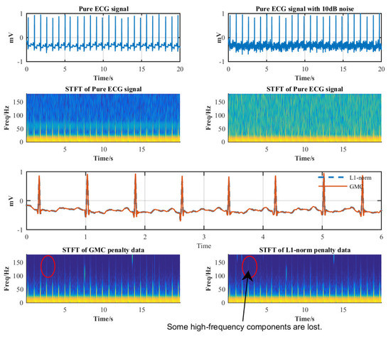 To gain more insights into the proposed algorithms, we plot the time-frequency relationships of the recovered ECG signals in Figure 9. It is observed that the GMC-based method preserves more high-frequency components than the -norm method, which can be perceived in the spectrogram.