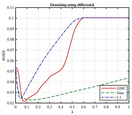 In order to improve the denoising performance, a variety of non-convex penalty terms have been developed to replace -norm [32,33,34]. Paper [32] proposes a weighted formulation of -norm minimization designed to more closer to the solution of -norm. In [33], the author uses penalty instead of -norm penalty. Paper [34] addresses the minimization problem of -regularized least squares for a continuum and propose two heuristic search algorithms. However, these methods adopt non-convex penalty to replace -norm, which leads to nonconvex objective functions. As a result, the algorithms become complicated and the solution is often stuck in the local optimal solutions. To overcome these drawbacks, a novel multivariate non-separable non-convex penalty, namely generalized minimax-concave (GMC) penalty, has been recently presented in [35,36]. The GMC penalty is a non-differentiable non-convex penalty obtained by subtracting a differentiable generalized Huber function from -norm. It strongly promotes sparsity while maintaining the convexity of the cost function.