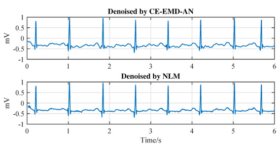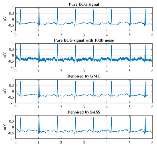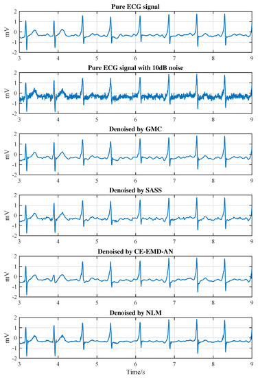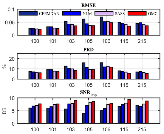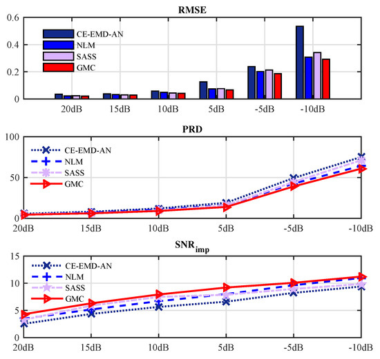 In Figure 11, we compare the rooted mean square error (), the percent root mean square difference () and the signal-to-noise ratio improvement achieved by different methods over different SNRs (20 dB 15 dB 10 dB 5 dB −5 dB −10 dB). The SASS [30], NLM [47] and CE-EMD-AN [48] algorithms are adopted as references. At each SNR, we average the results of all 48 data in the MIT-BIH database. It can be observed that the proposed GMC-based algorithm outperforms the referenced algorithms for all SNRs.