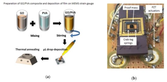 Sensor fabrication: (a) graphene‑oxide/polyvinyl‑alcohol (GO/PVA) composite preparation by solution mixing and deposition on the micromachined sensor and (b) the realized microsensor and four PZT elements used to move the device.