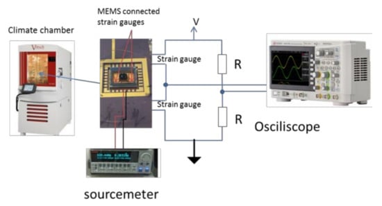 In order to validate the readout, based on the variation of the natural frequency of the mechanical oscillator as a function of the variation of RH, two integrated strain gauges were connected in a Wheatstone bridge and the output was acquired by using an oscilloscope (LeCroy waverunner 6050), as shown in Figure 2. Four piezoelectric elements (PZTs) have been used to mechanically excite the MEMS. Furthermore, a sourcemeter (Keithley-model 2636) was used to measure the variation of resistance of the functional material connected by using two integrated electrodes.