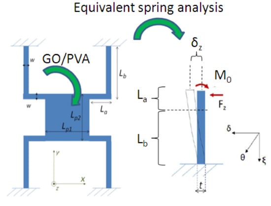 Under the hypotheses of uniform structure, symmetric geometry, small displacement oscillations and neglecting torsions between the two elements of each spring (La and Lb), the strain energy (U) of a single arm (in particular, an equivalent spring having a length L of La + Lb is considered here) can be found through the integration along the beam (ξ) (see Figure 4):