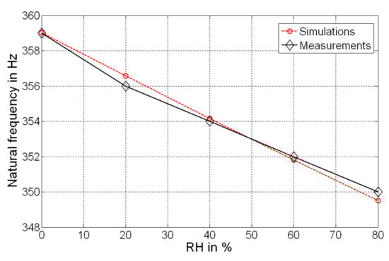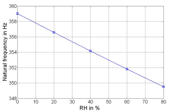 Simulated result: natural frequency as function of the relative humidity (RH).