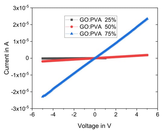 In this section, the results achieved by using the device described in the previous section and through the adoption of the setup presented in Section 2 are presented. In particular, the GO/PVA has been characterized and the choice of the final layer used (GO:PVA = 50%) is also correlated with this analysis. Figure 6 shows the IV characteristic of thin films of GO:PVA deposited by drop casting. From the current versus voltage graphs shown in Figure 6, the resistance decreases (~31.7 MΩ for 25% loading) by several orders of magnitude to reach ~2.6 MΩ and ~225.8 kΩ, for 50% and 75% loading, respectively. Therefore, it can be observed that decreasing the value of percentage RH, from 75% to 50%, does not provide a significant improvement in terms of a high value of resistance.