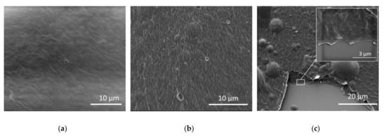 Scanning electron microscopy (SEM) images of GO/PVA at different mixing ratios: (a) 25%, (b) 50% and (c) 75%. The inset in (c) shows a cross-section, where stacked layer of GO are well-embedded in PVA polymer. Aggregation is mainly correlated with the nature of the drop-casting method, especially for a high percentage of GO, while for lower concentrations a more regular distribution can be observed.
