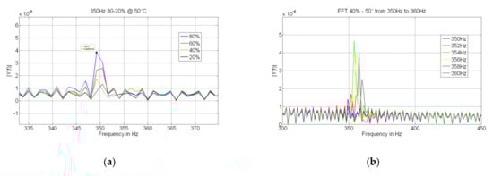 (a) FFT of the output of the bridge at 350 Hz (50 °C); (b) analysis around the mechanical resonance (at 40%, 50 °C).