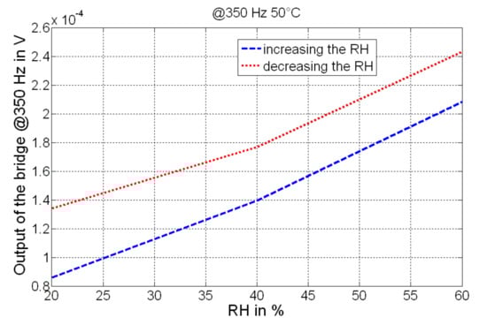 Output of the conditioning circuit used for the MEMS, considering the increasing and the decreasing condition of RH. The analysis has been conducted at a fixed sinusoidal excitation (evaluated at 350 Hz) and at a fixed temperature (50 °C).