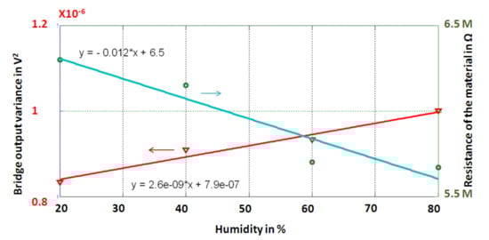 Figure 12 shows the two outputs: the bridge (variance) and the measured resistance of the GO/PVA for several values of humidity. As can be observed, the sensor is capable of measuring the target through the frequency domain and the resistance domain, by using the properties of the GO/PVA. A sensitivity of about −12 kΩ/RH% and ~0.1 Hz/RH% was estimated in the resistance and frequency domain, respectively. Furthermore, a resolution of ~1.8% RH has been experimentally estimated.
