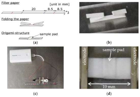Proposed paper-based analytical device (PAD) device. (a) How to make the proposed origami structure. A sample pad was put on the center of the folded paper. (b) Photograph of the origami structure. (c) The origami PAD connected to a portable power bank. (d) Close-up photograph of the PAD. Bulldog clips were used as electrodes.