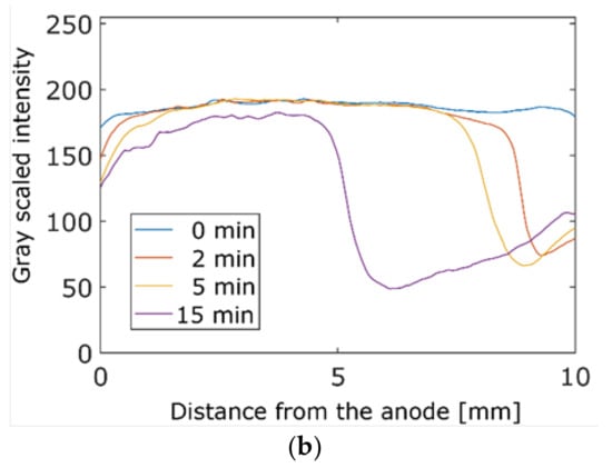 Time evolution of pH distribution after applying voltage to the buffer solution. (a) Typical photo images of the pH test paper. (b) Gray-scaled intensity distribution between the electrodes.