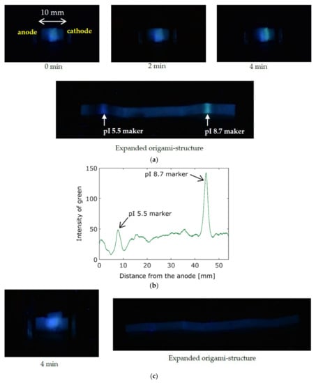 As shown in Figure 3a, the pI 5.5 and pI 8.7 markers slightly moved toward the left (anode) and right (cathode), respectively. The migration of both markers stopped after 4 min, and we interrupted the power supply from the portable power bank. The pI markers were separated after 4 min; however, we observed that the separation distance was small, as shown in Figure 3a. By expanding the origami structure, the separation distance was extended to about 40 mm, as shown in Figure 3a. Using a buffer solution with a pH value intermediate between the pI values of the target materials, the materials having lower and higher pI values would migrate in opposite directions; thus, our PAD enabled us to separate materials with short run time and low applied voltage. Figure 3b shows the intensity distribution of the green color extracted from the RGB image along the expanded paper. The intensity of the blue color was not considered because the effect of the illumination light was strong. The emission from the pI 8.7 marker was recognized at about 45 mm. This indicated that most of the pI 8.7 marker moved to the cathode. Since the green sensor of the camera was sensitive to wavelengths from about 400 to 600 nm, the offset of the intensity was about 40, due to the effect of the illumination light.