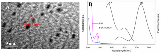 Gold nanoclusters were prepared by using BSA as a reducing and protecting agent. The solution was dark brown and emitted intense red fluorescence under ultraviolet (UV) light (365 nm). As depicted in the HRTEM image, AuNCs were spherical particles with an average diameter of ca. 1 nm. The lattice fringes of AuNCs had a discerned lattice spacing of 0.25 nm, which was ascribed to the d spacing of the {111} crystal plane of metallic Au (Figure 1A). The lattice spacing value is consistent with the previous report [33].